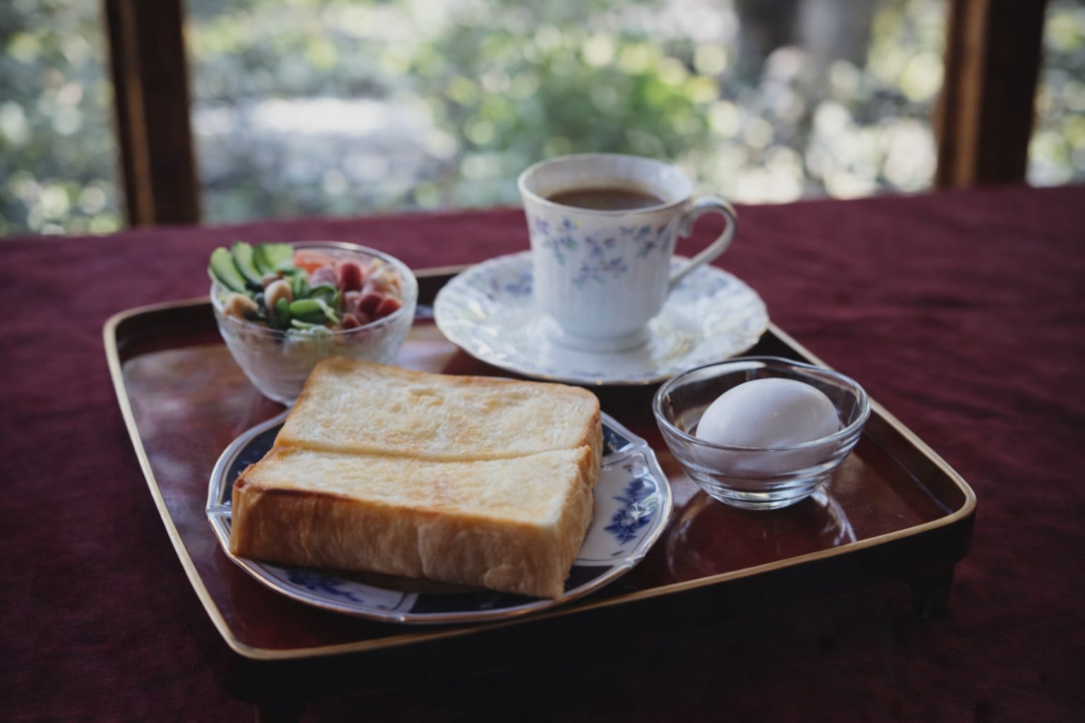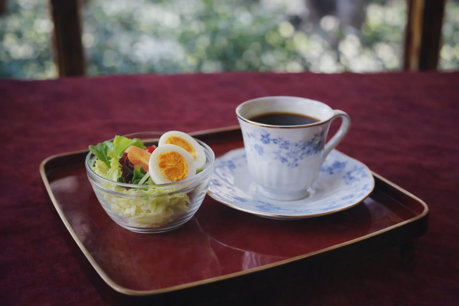 ミニサラダ・ゆで卵・コーヒーを添えた